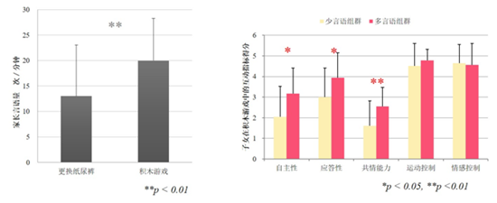 然而,測試結(jié)果未顯示出積木游戲情境下母親發(fā)出的言語量和孩子的互動(dòng)指標(biāo)評價(jià)得分具有關(guān)聯(lián)性。積木游戲情境下因?yàn)橛H子需要共同努力完成目標(biāo),所以比較容易發(fā)出言語,反之更換紙尿褲時(shí)即便沒有言語溝通對操作也沒有什么影響。實(shí)際上,反而是在這種情境下的言語可以關(guān)系到孩子的社會(huì)性發(fā)展。