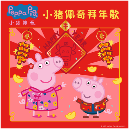 中國(guó),上海(2021年2月4日)-- 2021牛年春節(jié)馬上就要到來,為了陪伴大家共度這個(gè)團(tuán)圓美好的節(jié)日,孩之寶全球娛樂工作室eOne旗下動(dòng)畫品牌“小豬佩奇”正式推出《小豬佩奇拜年歌》。目前,這首極具中國(guó)年味的歌曲已經(jīng)在QQ音樂和網(wǎng)易云音樂上線。這是繼《小豬佩奇咚咚鏘拜年歌》后,“小豬佩奇”再一次以歌曲的形式為全國(guó)的小朋友和家庭送來新春祝福。