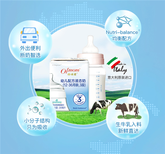 作為母乳補充的產(chǎn)品之一,Ofmom媽咪愛嬰幼兒配方液態(tài)奶粉同樣根據(jù)不同年齡段寶寶對營養(yǎng)需求的不同,分為1、2、3階段產(chǎn)品,精準滿足寶寶成長發(fā)育所需的營養(yǎng)元素。其中,獨有的Nutri-balance?營養(yǎng)均衡配方,給寶寶帶來了更加貼近母乳的均衡營養(yǎng)。還特別添加了有助于寶寶神經(jīng)系統(tǒng)、視力和智力發(fā)育的DHA、ARA、?;撬岷秃亲o寶寶腸道健康的(FOS+GOS)益生元,多種營養(yǎng)成分共同促進寶寶身體和骨骼健康發(fā)育。