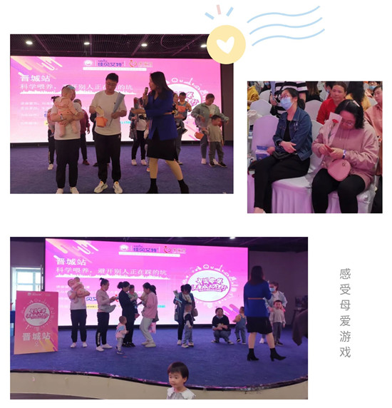 晉城站,活動(dòng)伊始工作人員為現(xiàn)場(chǎng)的媽媽們送上了康乃馨,并組織現(xiàn)場(chǎng)家長(zhǎng)一起進(jìn)行互動(dòng)游戲《感受母愛(ài)》,給初為人母的媽媽們一個(gè)幸福的母親節(jié),也給現(xiàn)場(chǎng)的寶爸們一個(gè)對(duì)自己妻子和母親表達(dá)愛(ài)意的機(jī)會(huì),現(xiàn)場(chǎng)的媽媽們都露出了幸福的笑容。