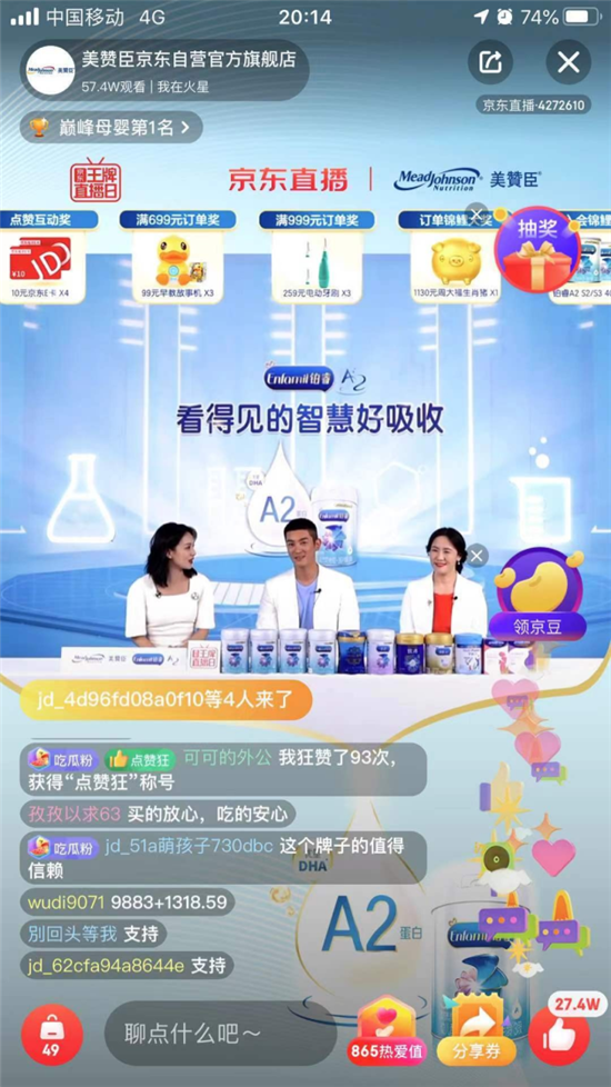 針對上述思考,6月16日晚19:30,美贊臣攜手京東王牌直播欄目打造了一場直播,以“鉑睿A2,看得見的智慧好吸收”為主題切入,”學(xué)霸媽媽+明星奶爸+博士研發(fā)總監(jiān)+營養(yǎng)科學(xué)家”組成智慧營養(yǎng)推薦天團(tuán),結(jié)合寶爸寶媽選擇奶粉的痛點(diǎn),用趣味性表達(dá)科普專業(yè)知識,直播間互動破百萬,榮登巔峰母嬰榜單TOP1,以實(shí)力引爆直播出圈狂潮。