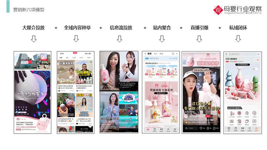 在營銷上,這是我總結(jié)的新六項營銷模型——大媒介投放+全域內(nèi)容種草+信息流投放+站內(nèi)聚合+直播引爆+私域閉環(huán)。我們發(fā)現(xiàn),兒科醫(yī)生、育嬰專家對在母嬰人群的影響最大,分別占比達到了63.7%和56.5%。所以在全域內(nèi)容種草板塊,紅色小象持續(xù)以專家背書為核心,通過達人測評+明星寶爸寶媽種草+全域曝光的組合拳方式,去打透各類母嬰人群,持續(xù)建設品牌口碑。