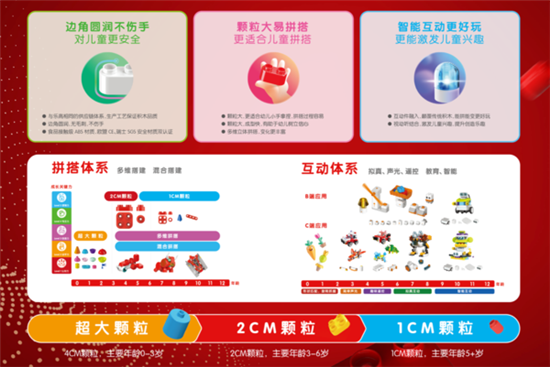 已是第二年參展CBME嬰童展的布魯可積木,近年來持續(xù)深耕并深度拓展母嬰產(chǎn)品體系?;仡欉^去,創(chuàng)立之初的布魯可從“兒童積木”細分品類切入市場,與行業(yè)巨頭形成差異化競爭,通過大顆粒積木產(chǎn)品迅速贏得市場青睞。經(jīng)過多年研發(fā)升級,布魯可構建了創(chuàng)新的產(chǎn)品體系:以超大顆粒、大顆粒及小顆粒三種顆粒規(guī)格為主的拼搭體系。