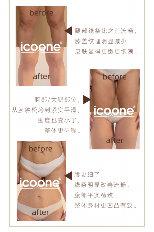 她簽約icoone?一個(gè)月療程,通過每兩天做一次、總共15次的療程后,不僅形體改善、身材緊實(shí),皮膚變得緊致滑嫩、顯得更年輕了。不同于一個(gè)月之前灰心低落的狀態(tài),現(xiàn)在整個(gè)人都容光煥發(fā),找回了自信,在鏡頭前也大方分享蛻變的快樂。