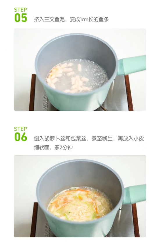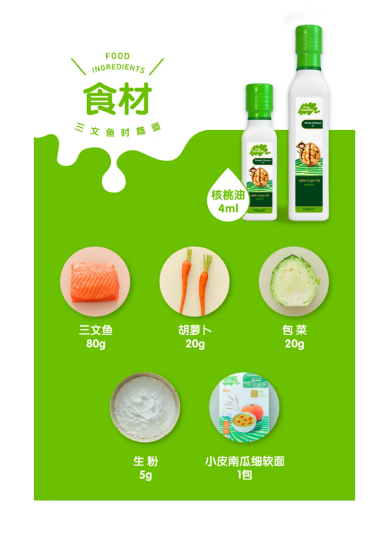 食材:小皮核桃油4ml,三文魚80g,胡蘿卜20g,包菜20g,生粉5g,小皮南瓜細軟面1包。