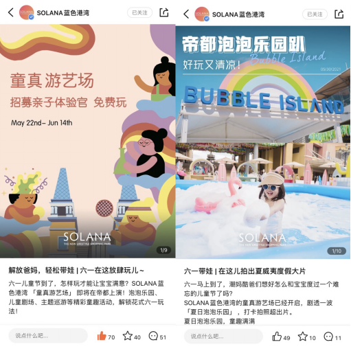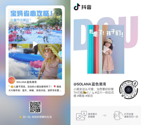 SOLANA藍(lán)色港灣發(fā)起活動(dòng),在小紅書、大眾點(diǎn)評(píng)等社交媒體平臺(tái)招募“活動(dòng)體驗(yàn)官”,打卡六一活動(dòng)現(xiàn)場(chǎng)。深度線下體驗(yàn)經(jīng)歷轉(zhuǎn)換為可分享、可互動(dòng)的優(yōu)質(zhì)內(nèi)容,吸引粘性顧客的同時(shí),透過(guò)KOC的群體屬性極好地傳遞活動(dòng)信息與亮點(diǎn)。在抖音、小紅書這樣的主流社交平臺(tái)和“公域”中,實(shí)現(xiàn)規(guī)模聲量。除了鞏固已有的親子客群,也為線下吸引了一大批優(yōu)質(zhì)新生代萌寶家庭。