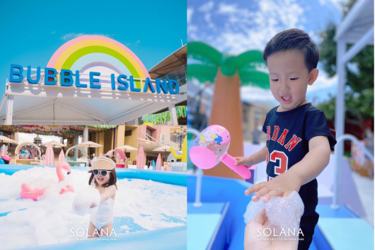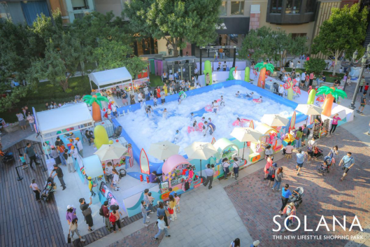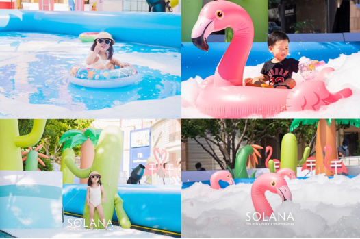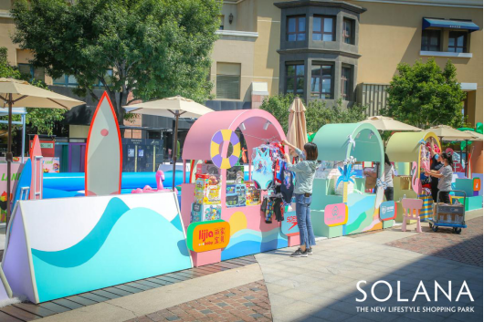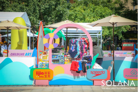 除了在城市中心搭建了一個(gè)海邊度假樂(lè)園,提供了親子娛樂(lè)的沉浸式游玩空間;SOLANA藍(lán)色港灣同時(shí)策劃了“購(gòu)物+娛樂(lè)+互動(dòng)課堂”的場(chǎng)景化營(yíng)銷模式,深度聯(lián)動(dòng)場(chǎng)內(nèi)商戶出街售賣,構(gòu)建消費(fèi)體驗(yàn)閉環(huán),為沒(méi)有自帶游玩裝備的萌寶家庭提供游泳等游玩裝備,也為商戶提供了展示以及銷售空間,全面賦能兒童及其他零售業(yè)態(tài),幫助商戶增加銷售轉(zhuǎn)化。